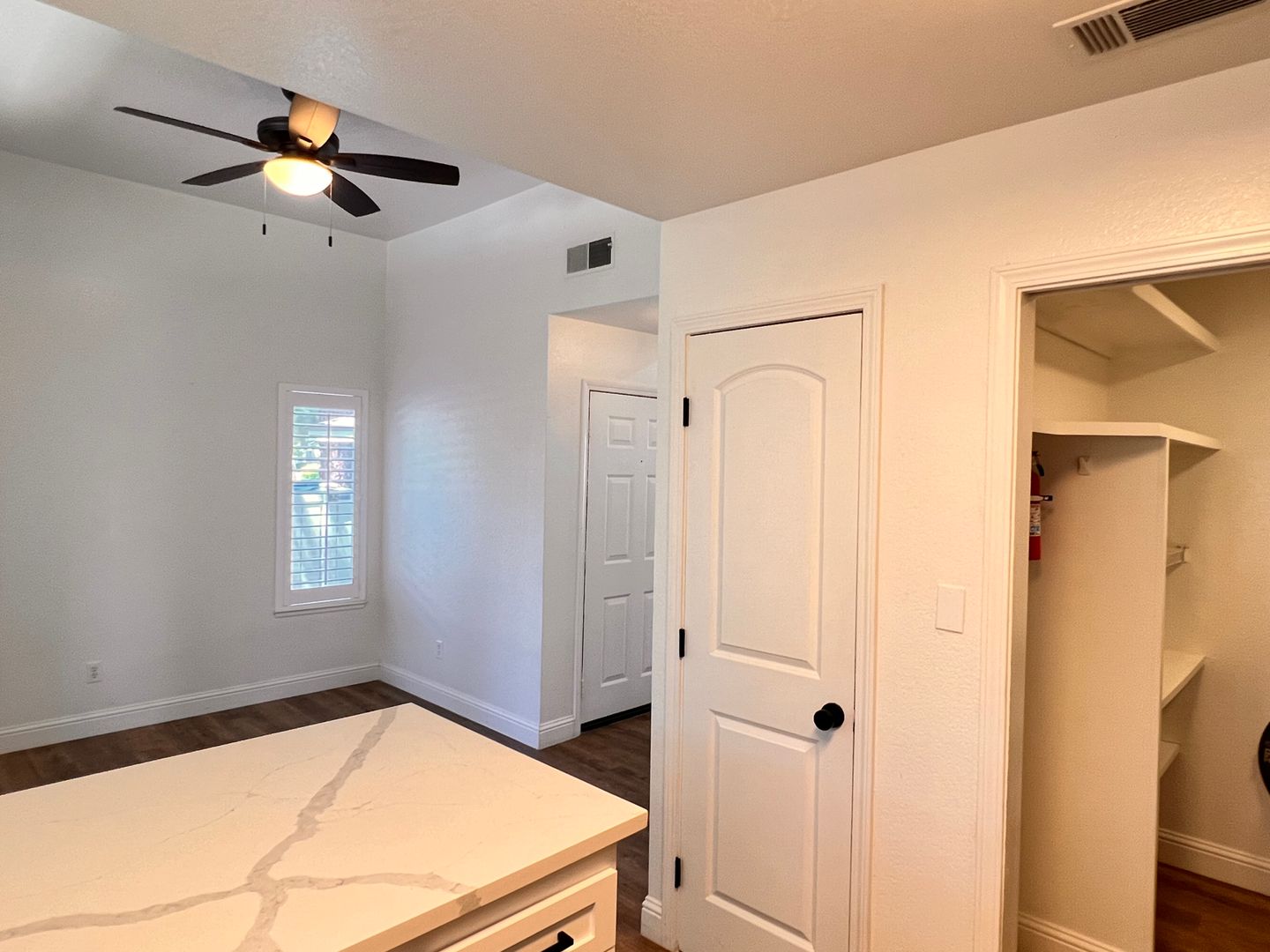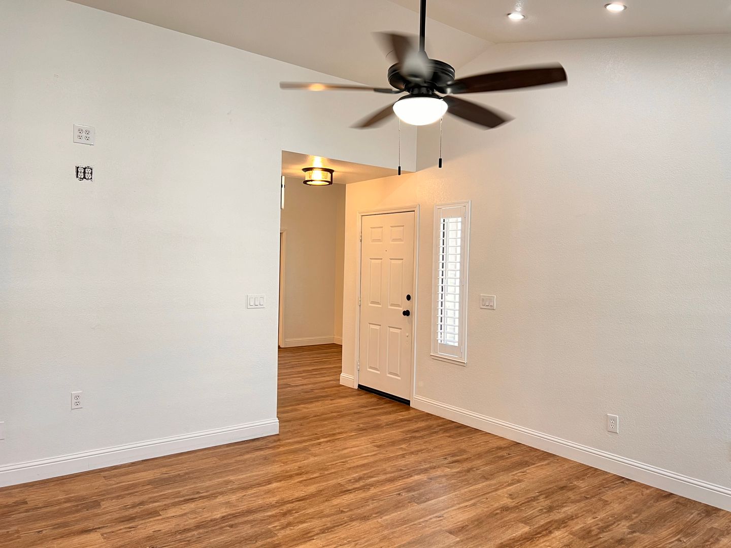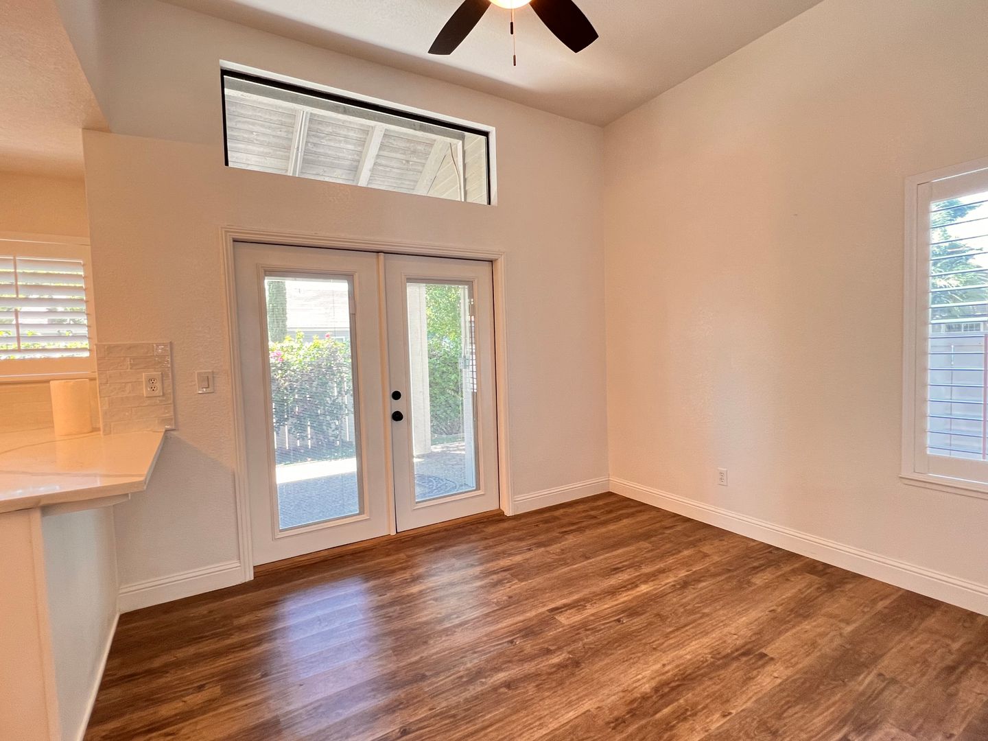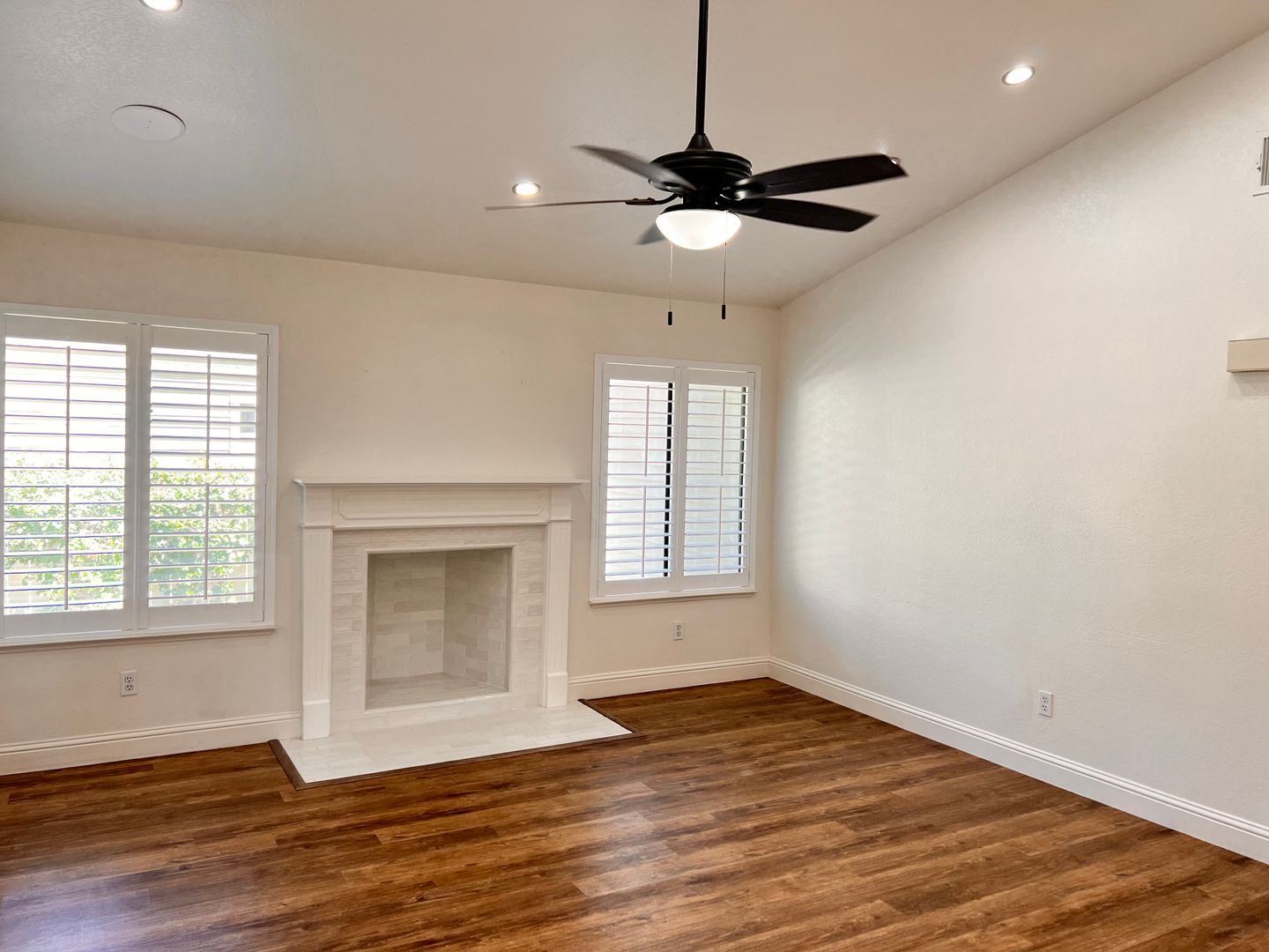 Inside, you’ll find wood-look flooring throughout, fresh neutral paint, updated lighting, and ceiling fans. The living room features a cozy fireplace and abundant natural light with plantation shutters.