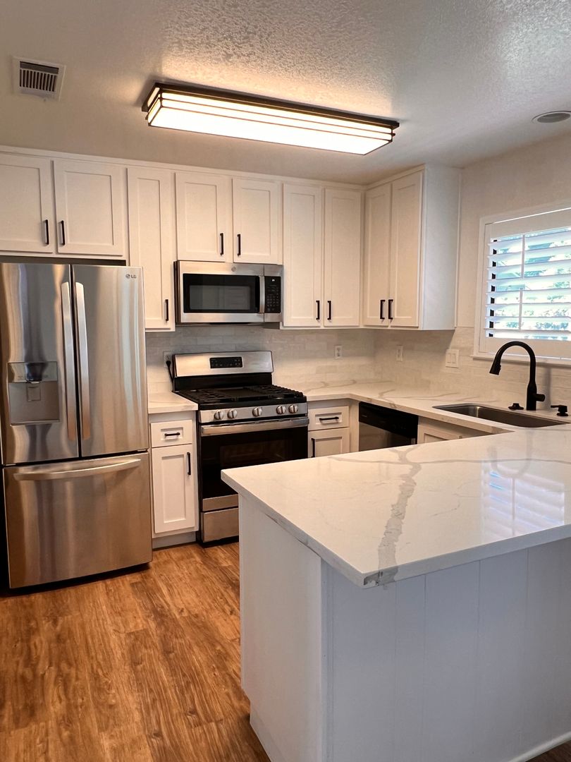 The upgraded kitchen includes white shaker cabinets, quartz countertops, stainless steel appliances, subway tile backsplash, modern black hardware, and a peninsula with additional seating space.